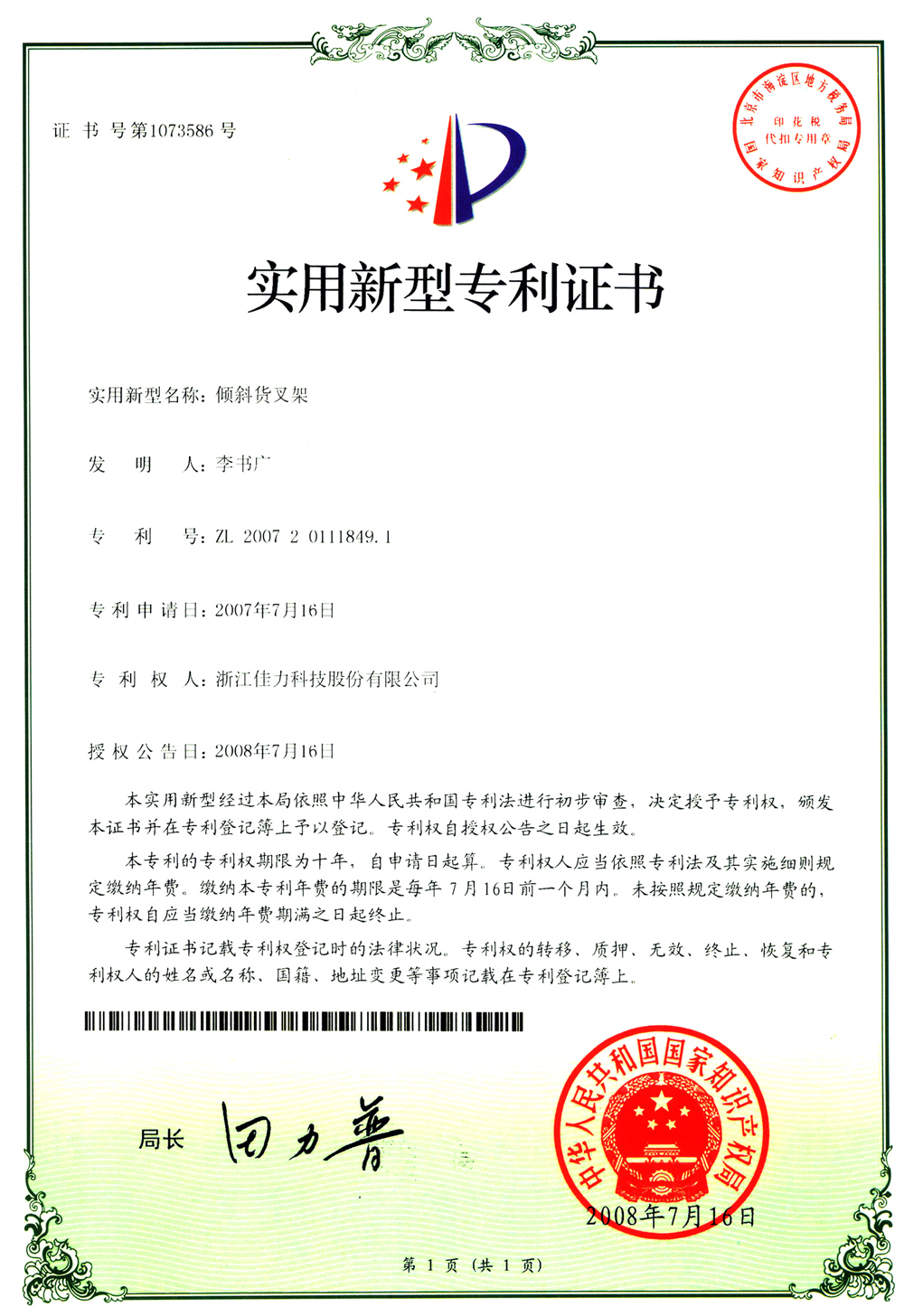 實(shí)用新型專利證書