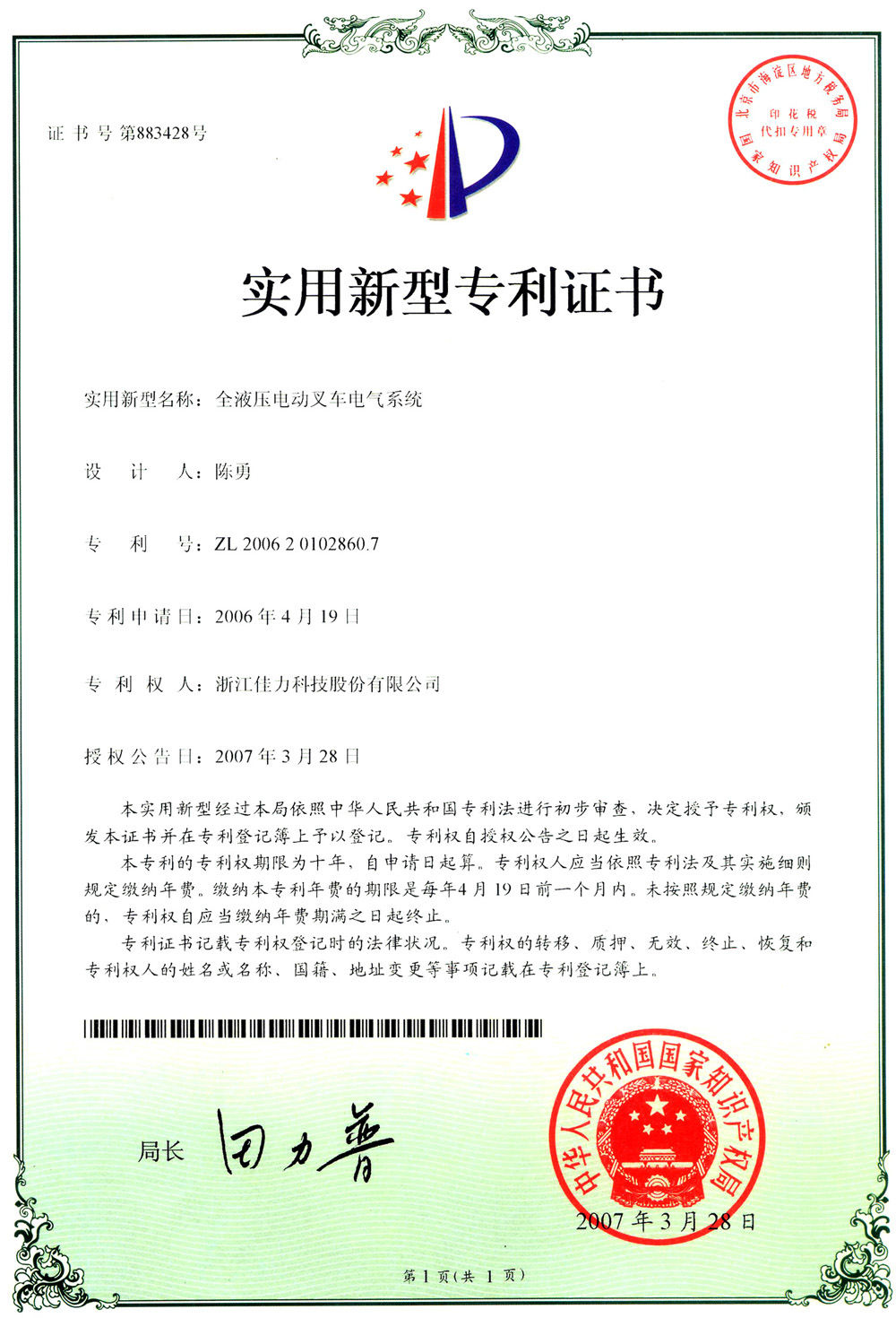 實(shí)用新型專利證書